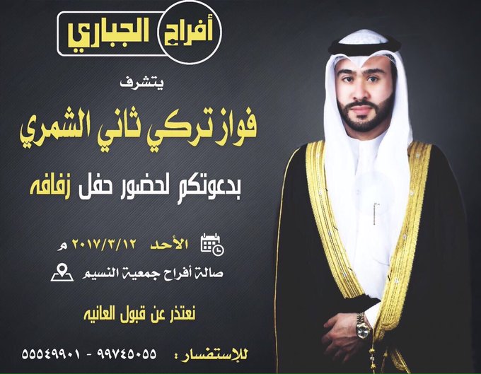 https://pbs.twimg.com/media/C6kC6e_U8AAbTbJ.jpg:small افراح الجباري يتشرف فواز تركي ثاني الشمري بدعوتكم لحضور حفل زفافه الاحد 12-3-2017 صالة افراح جمعية النسيم |