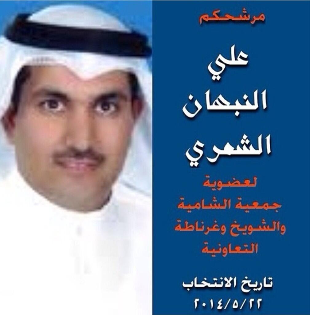 مرشح جمعية الشامية والشويخ التعاونية ٢٠١٤ علي النبهان الشمري موعد الانتخابات ٢٢-٥-٢٠١٤ https://pbs.twimg.com/media/BnGc_l5CAAAY9jY.jpg:large |