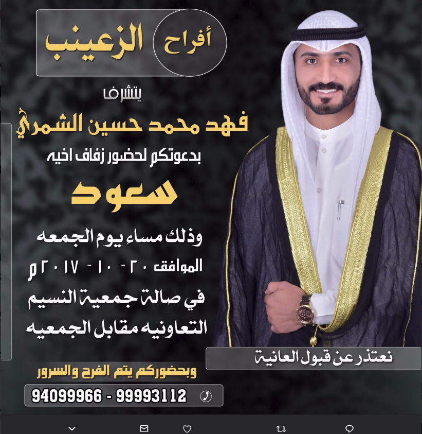 يتشرف فهد محمد حسين الشمري بدعوتكم لحضور حفل زفاف أخيه سعود الجمعة 20-10-2017 صالة جمعية النسيم http://gulfupp.com/do.php?img=4068 |